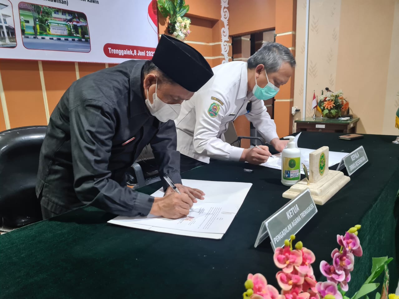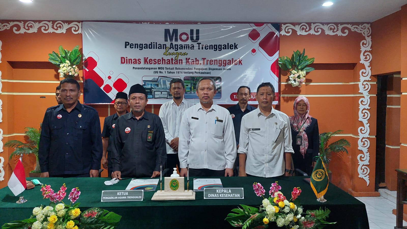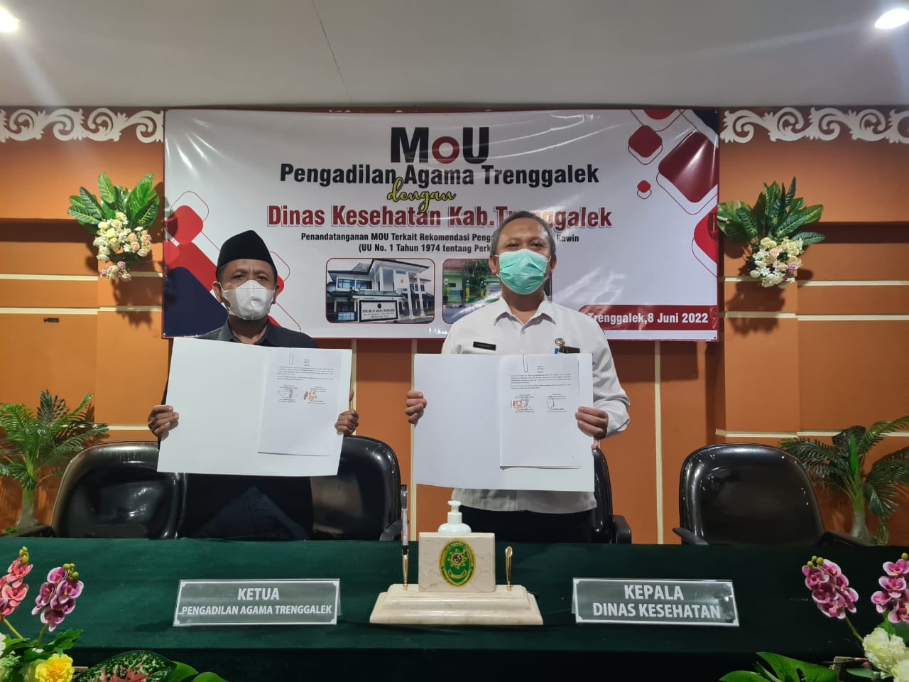 Bertempat di Media Center Pengadilan Agama Trenggalek dilaksanakan Perjanjian Kerjasama (MOU) dengan Dinas Kesehatan Kabupaten Trenggalek (Rabu, 8 Juni 2022), dihadiri Ketua Pengadilan Agama Trenggalek, Wakil Ketua, Hakim, Panitera, Sekretaris, Pejabat Kepaniteraan dan Kepala Dinas Kabupaten Trenggalek beserta jajarannya. Perjanjian Kerjasama (MoU) dilaksanakan untuk menindaklanjuti surat Direktur Jenderal Badan Peradilan Agama Mahkamah Agung RI Nomor :2449 /DjA/HM.00/4/2022 tanggal 22 April 2022 perihal Koordinasi dan Melakukan Perjanjian Kerjasama dengan Dinas Kesehatan.