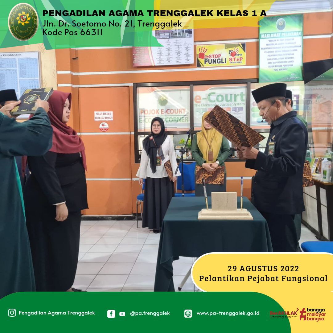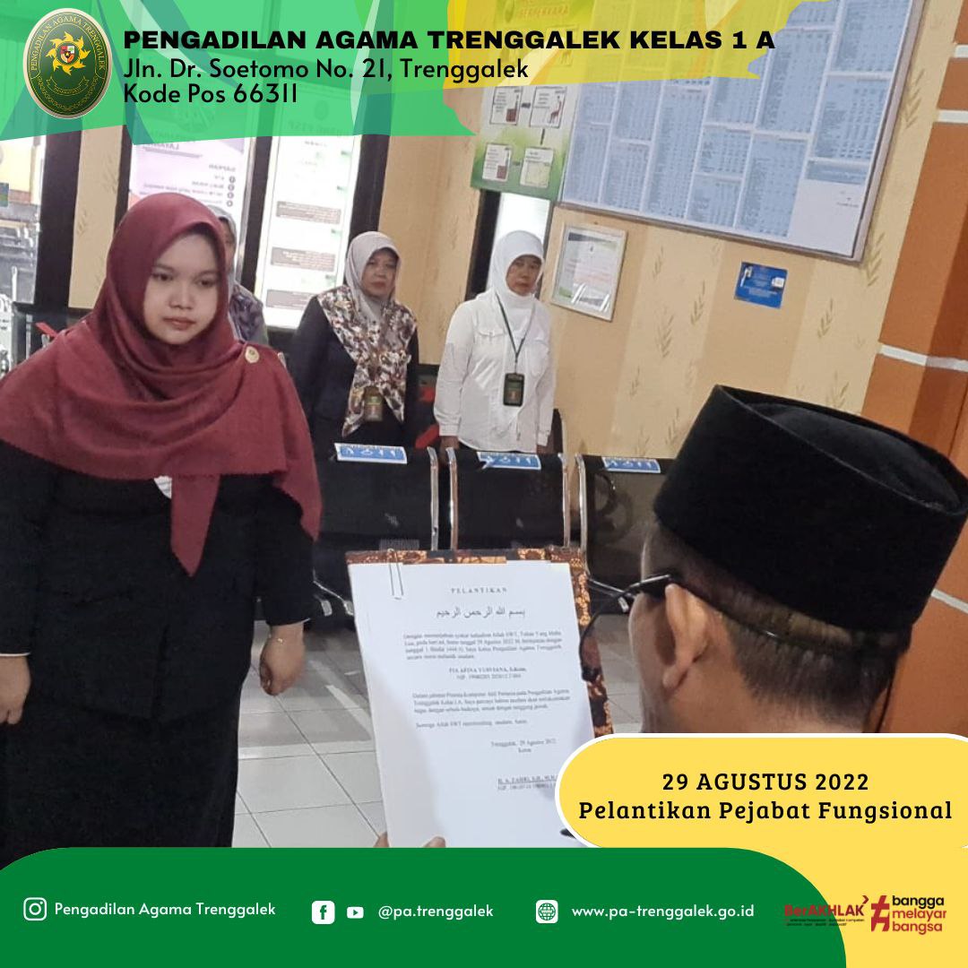 Bertempat di Ruang Tunggu Pelayanan Terpadu Satu Pintu (PTSP) Pengadilan Agama Trenggalek, dilangsungkan acara pelantikan dan sumpah Pegawai Negeri Sipil Pengadilan Agama Trenggalek. Pejabat yang dilantik dan diambil sumpahnya yaitu Fia Afina Yusviana, S.Kom. NIP 19980203 202012 2 004 yang merupakan PNS Golongan III/a untuk Jabatan Fungsional Pranata Komputer Ahli Pertama Pengadilan Agama Trenggalek. Pelantikan ini didasarkan pada Surat Keputusan Sekretaris Mahkamah Agung Republik Indonesia Nomor 1004/SEK/KP.I/SK/VIII/2022 tanggal 1 Agustus 2022 tentang Pengangkatan Pertama Kali Dalam Jabatan Pranata Komputer Keahlian
