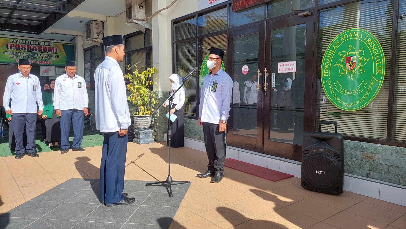 Sebagai wujud Implementasi kedisiplinan segenap Aparatur Pengadilan Agama Trenggalek baik Pejabat Fungsional maupun Struktural dan Staf, Senin 31 Oktober 2022 bertempat di Halaman Kantor diselenggarakan Apel Pagi yang dipimpin oleh Ketua Pengadilan Agama Trenggalek Drs. SAMSUL AMRI, S.H., M.H., selaku pembina upacara. Dalam sambutannya beliau menyampaikan beberapa hal yang harus senantiasa dipegang dan dilaksanakan sebagai Aparatur Sipil Negara pada Peradilan Agama khususnya Pengadilan Agama Trenggalek antara lain terkait Komitmen. Komitmen merupakan Perjanjian pada diri sendiri terhadap instansi dimana kita bekerja untuk dilaksanakan dengan baik dan penuh tanggungjawab.