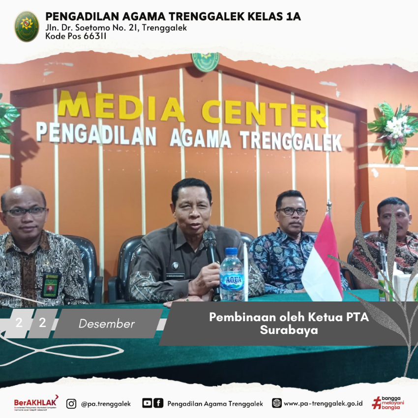 Berlanjut di kunjungan hari kedua, beliau menggelar acara Pembinaan Aparatur Pengadilan Agama Trenggalek. Bertempat di Ruang Media Center, meskipun dengan kondisi ruangan yang kurang memadai hal tersebut tidak menyurutkan antusias seluruh aparatur PA Trenggalek untuk mengikuti pembinaan tersebut. Diawal sambutannya, beliau menyampaikan terima kasih atas sambutan hangat yang diberikan oleh seluruh aparatur. Beliau juga menuturkan bahwa PTA Surabaya juga akan mengusahakan pembangunan gedung kantor pada 4 (Empat) Gedung Pengadilan Agama di Jawa Timur, yang salah satunya adalah PA Trenggalek. “Dengan adanya hibah tanah oleh Pemkab Trenggalek kepada PA Trenggalek ini, PTA Surabaya akan mengusahakan untuk PA Trenggalek mendapatkan anggaran belanja modal dari Mahkamah Agung untuk pembangunan gedung.”, begitu ungkapan beliau dalam memberikan dukungannya pada PA Trenggalek.