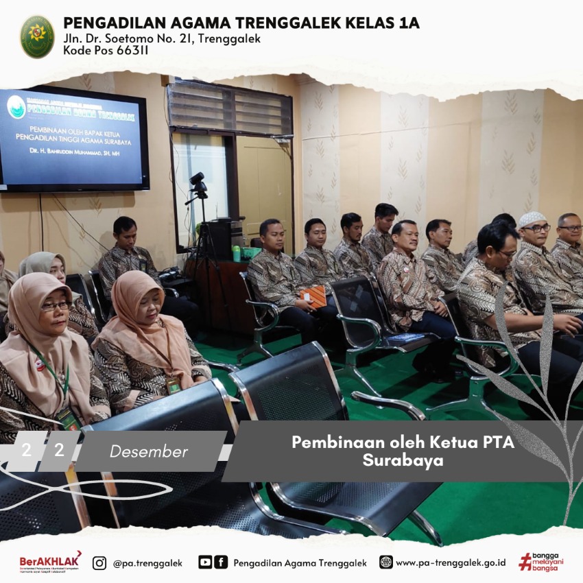Terlihat kesibukan yang berbeda pada hari Rabu tanggal 21 Desember 2022, pasalnya Ketua Pengadilan Tinggi Agama Surabaya, Dr. H. Bahruddin Muhammad, S.H, M.H melakukan kunjungan dinas di Pengadilan Agama Trenggalek. Kunjungan ini merupakan yang pertama semenjak beliau menjabat sebagai Ketua Pengadilan Tinggi Agama Surabaya. Setelah dilakukan penyambutan langsung oleh Ketua Pengadilan Agama Trenggalek, Drs. Samsul Amri, S.H., M.H dan dilanjutkan dengan meninjau lokasi rencana pembangunan gedung kantor PA Trenggalek. Lokasi pembangunan tersebut berada di Jalan Brigjend Sutran, Ngantru, Kecamatan Trenggalek. Tanah tersebut merupakan Hibah dari Pemerintah Daerah Kabupaten Trenggalek dan saat ini telah menjadi atas nama Mahkamah Agung RI.