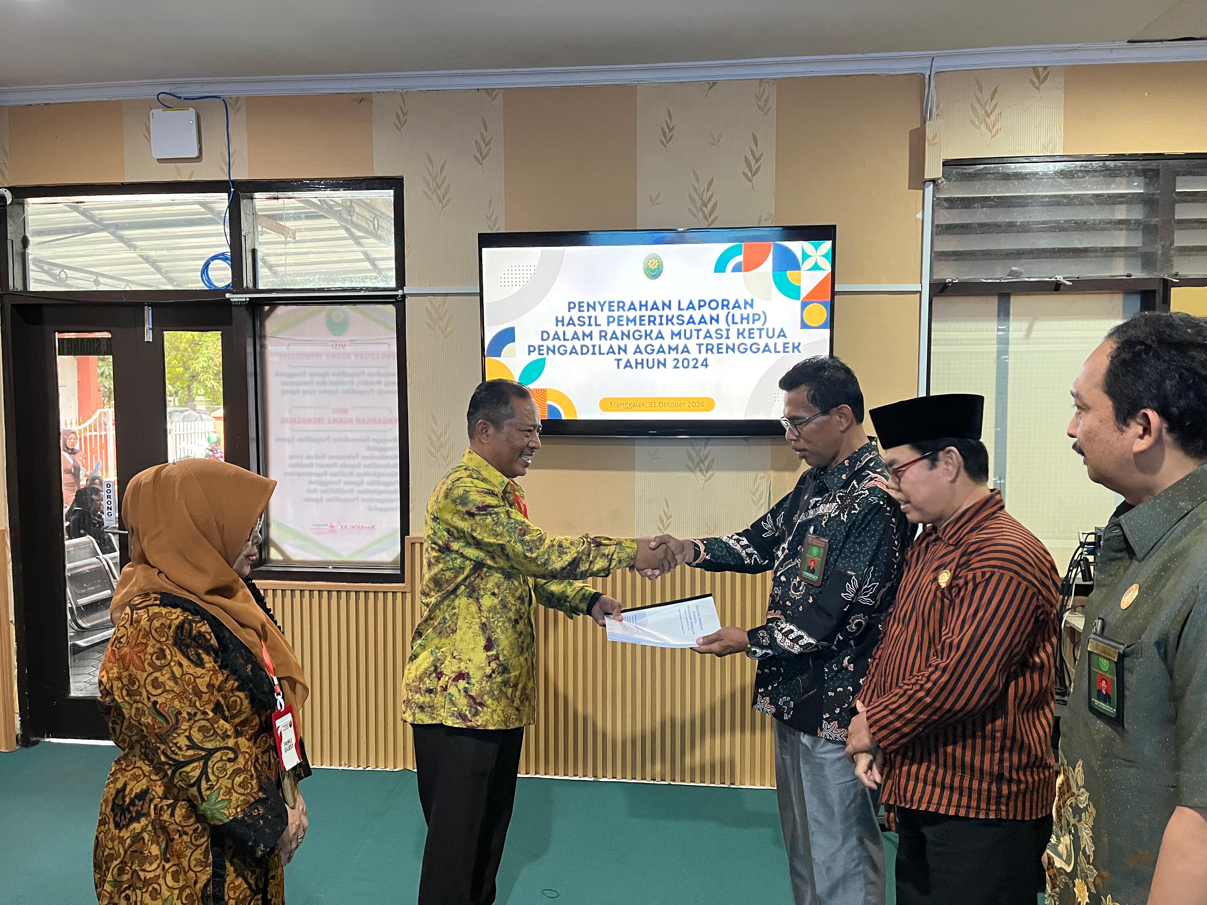 Diakhir pelakasanaan Audit/Pemeriksaan dalam rangak Mutasi Ketua Pengadilan Agama Trenggalek dilaksanakan Penyerahan Laporan Hasil Pemeriksaan (LHP) yang diserahkan oleh Pemeriksa/Hakim Tinggi Agama Surabaya beserta pendamping kepada Ketua Pengadilan Agama Trenggalek yang akan Mutasi ke Pengadilan Agama Jember. Penyerahan Laporan Hasil Pemeriksaan didampingi oleh Panitera dan Sekretaris Pengadilan Agama Trenggalek.