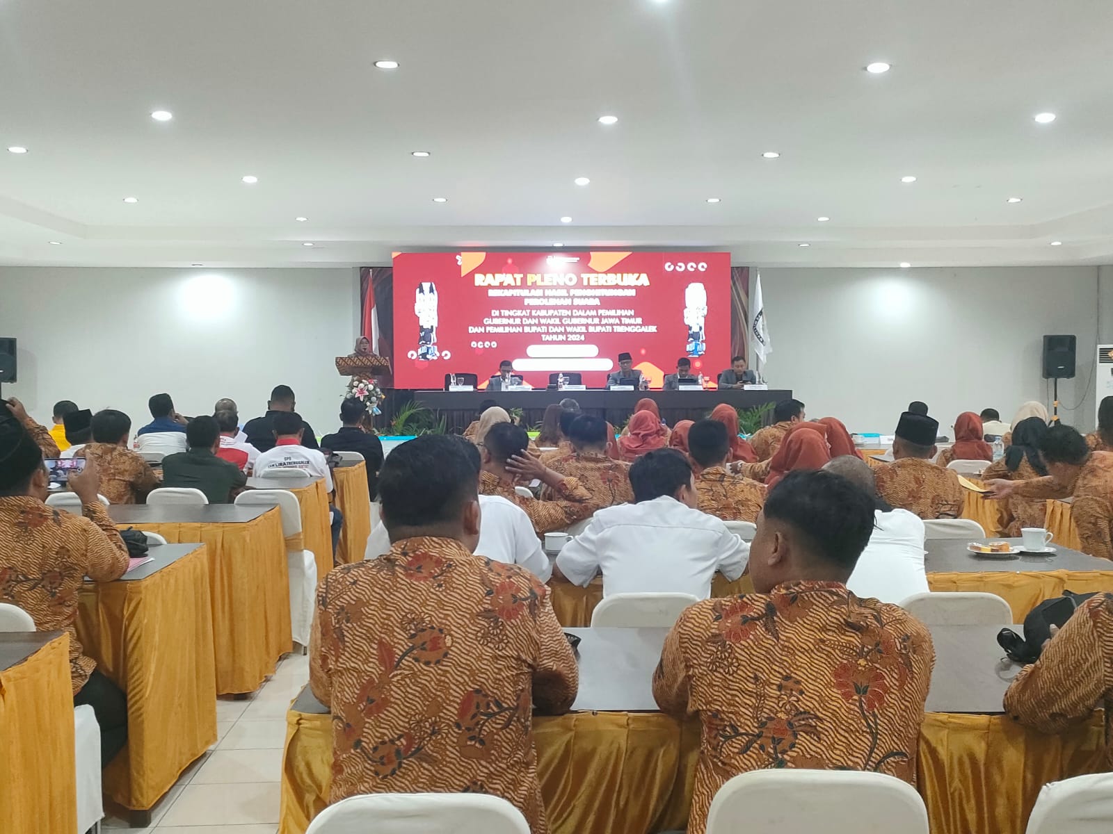 Ketua Komisi Pemilihan Umum (KPU) Kabubapen Trenggalek Istatiin Nafiah, S.Pd.I didampingi anggota KPU memimpin jalannya sidang. Hadir juga pada kegiatan ini undangan lainnya dari unsur Forkopimda, instansi/dinas dan masyarakat. Rekapitulasi Hasil Penghitungan Perolehan Suara di Tingkat Kabubaten dalam pemilihan Gubernur dan Wakil Gubernur Jawa Timur dan Pemilihan Bupati dan Wakil Bupati Trenggalek Tahun 2024 berdasarkan hasil pelaksanaan Pemilihan Kepala Daerah (Pilkada) yang telah dilaksanakan secara serentak pada tanggal 27 November 2024 yang merupakan pesta demokrasi dan terselenggara dengan lancar, aman serta kondusif.