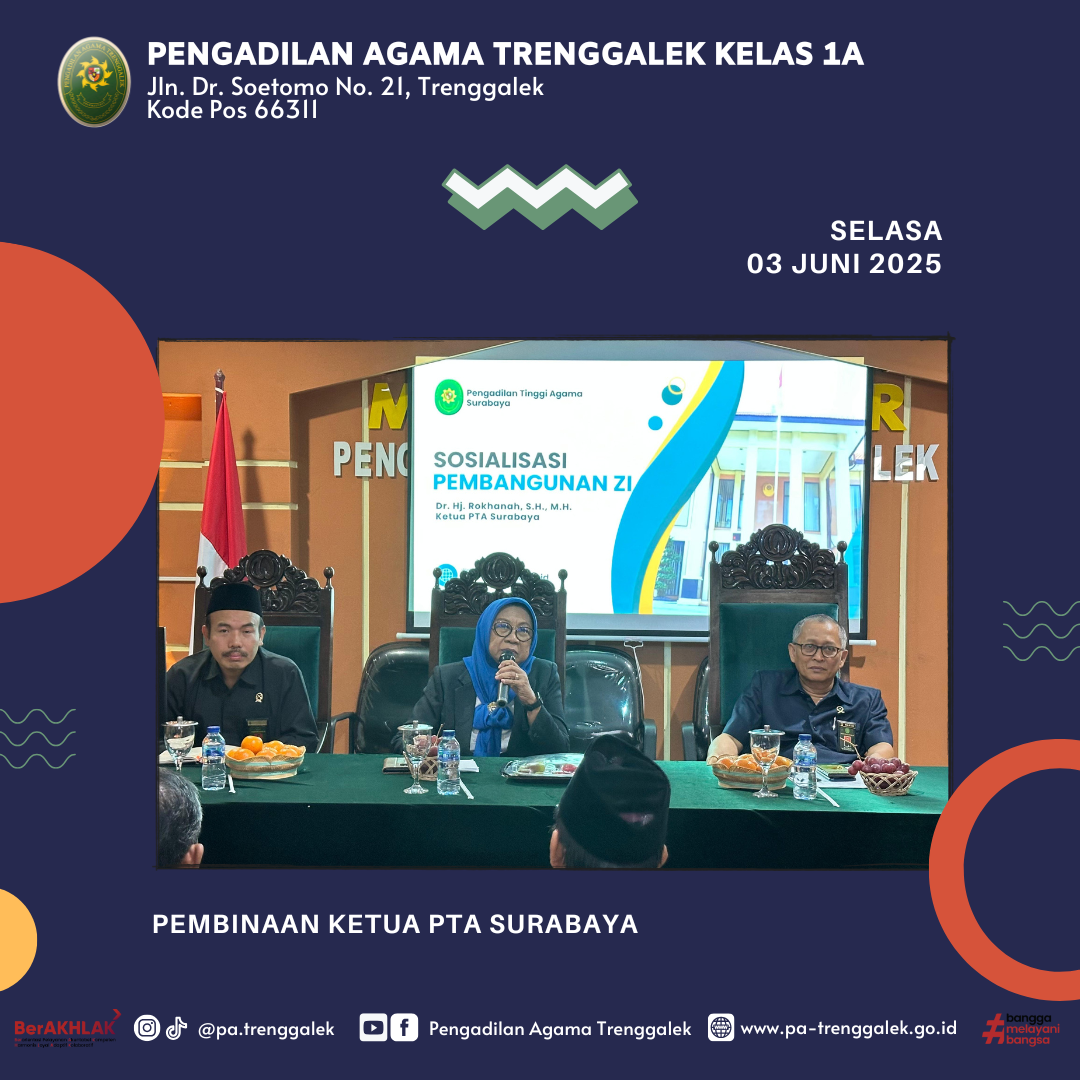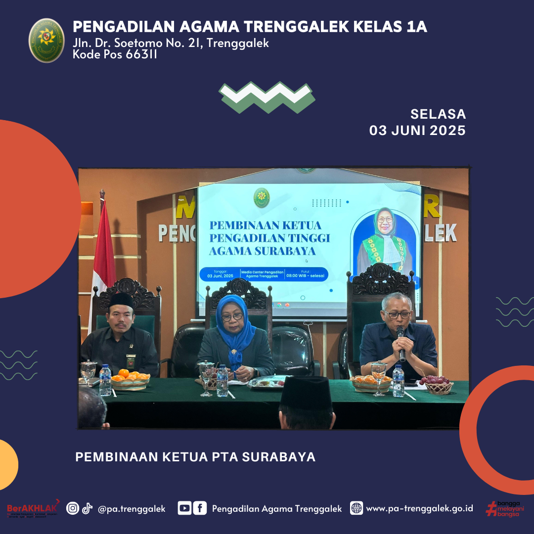 Trenggalek, Selasa 03 Juni 2025 – Ketua Pengadilan Tinggi Agama (PTA) Surabaya, Dr. Hj. Rokhanah, S.H., M.H., melakukan kunjungan kerja sekaligus memberikan pembinaan kepada seluruh aparatur Pengadilan Agama (PA) Trenggalek bertempat di ruang Media Center yang didampingi oleh Pimpinan Pengadilan Drs. H. Faiq, M.H. (Ketua) dan Fahruddin, S.Ag., M.H. (Wakil Ketua).