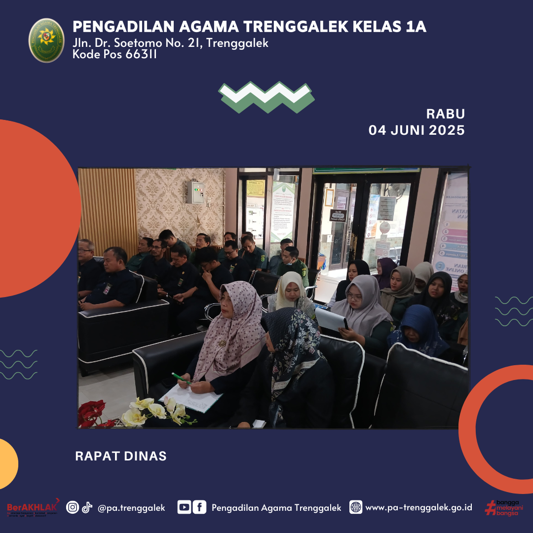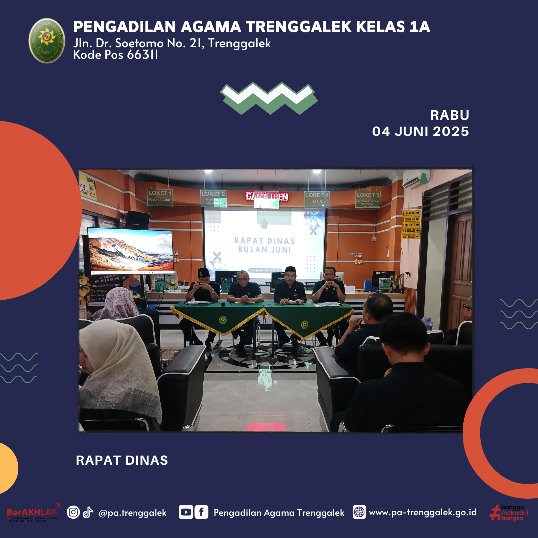 Trenggalek, Rabu 4 Juni 2025 — Pengadilan Agama Trenggalek menggelar rapat dinas rutin bulan Juni yang bertempat di ruang PTSP Rapat dipimpin langsung oleh Ketua Pengadilan Agama Trenggalek, Drs. H. Faiq, M.H., dan dihadiri oleh Wakil Ketua, para Hakim, Panitera, Sekretaris, Pejabat Struktural dan Fungsional, serta seluruh pegawai.