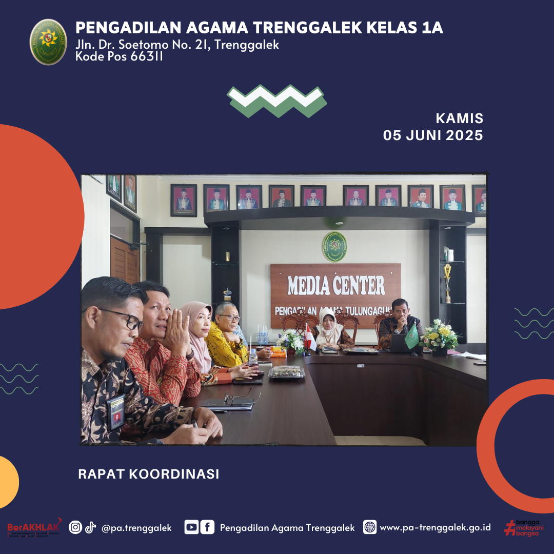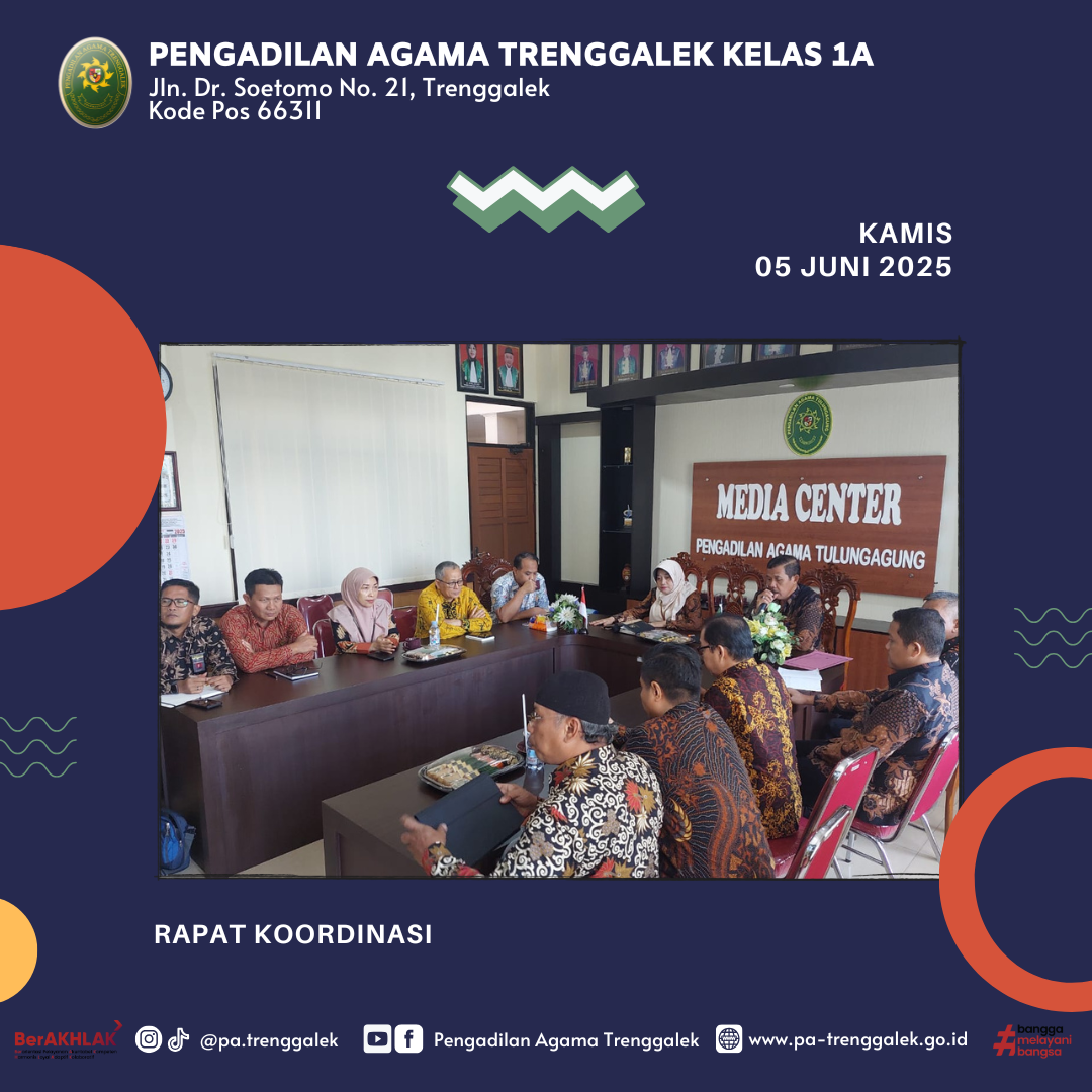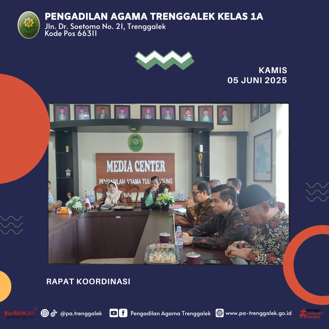 Trenggalek, 05 Juni 2025 — Ketua Pengadilan Agama Trenggalek Drs. H. Faiq, M.H. menghadiri Rapat Koordinasi Pengadilan Agama se-Koordinator Kediri yang dilaksanakan di Pengadilan Agama Tulungagung pada hari Kamis, 05 Juni 2025. Rapat ini dihadiri oleh para Ketua, Panitera, dan Sekretaris Pengadilan Agama wilayah Koordinator Kediri, meliputi Pengadilan Agama Trenggalek, PA Tulungagung, PA Biltar, PA Kota Kediri, dan PA Kab. Kediri.