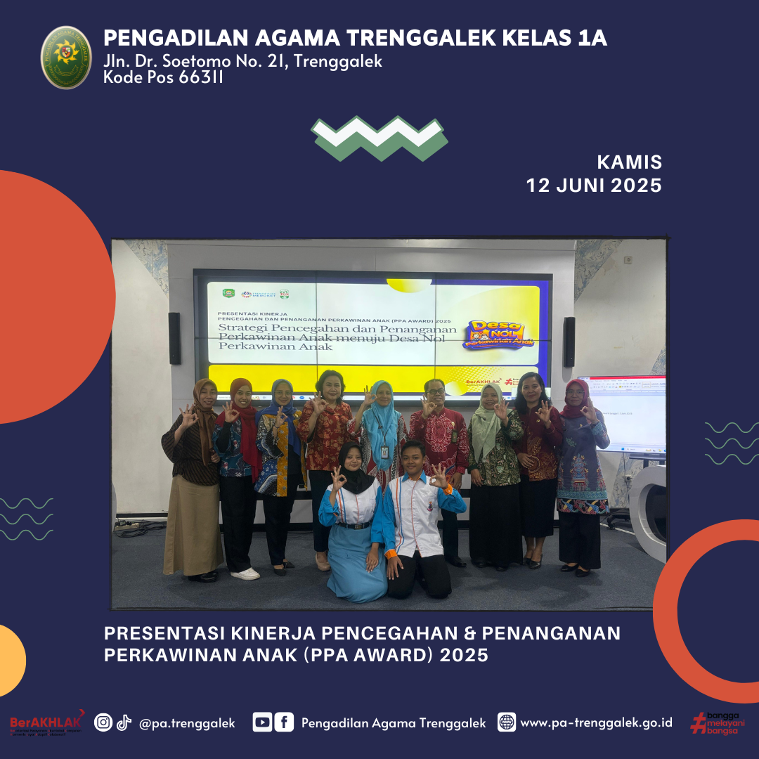 Bertempat di Smart Center, Pendhapa Manggala Praja Kabupaten Trenggalek tengah dilaksanakan Agenda Penilaian Kinerja Pencegahan dan Penanganan Perkawinan Anak (PPA Award) oleh Tim Penilai Provinsi Jatim. Agenda tersebut berupa presentasi kinerja yang dilakukan secara daring. Dalam kegiatan tersebut, Pengadilan Agama (PA) Trenggalek, yang diwakili oleh Bapak Panitera, H. Hadiyatullah, S.H., M.H. mendapatkan apresiasi tinggi dari Sekretaris Daerah (Sekda) Kabupaten Trenggalek dan Kepala Dinas Sosial Pemberdayaan Perempuan dan Perlindungan Anak (Dinsos PPPA) (Kadinsos) dalam agenda penilaian dan pemaparan secara daring bersama Tim Penilai dari Provinsi Jawa Timur.