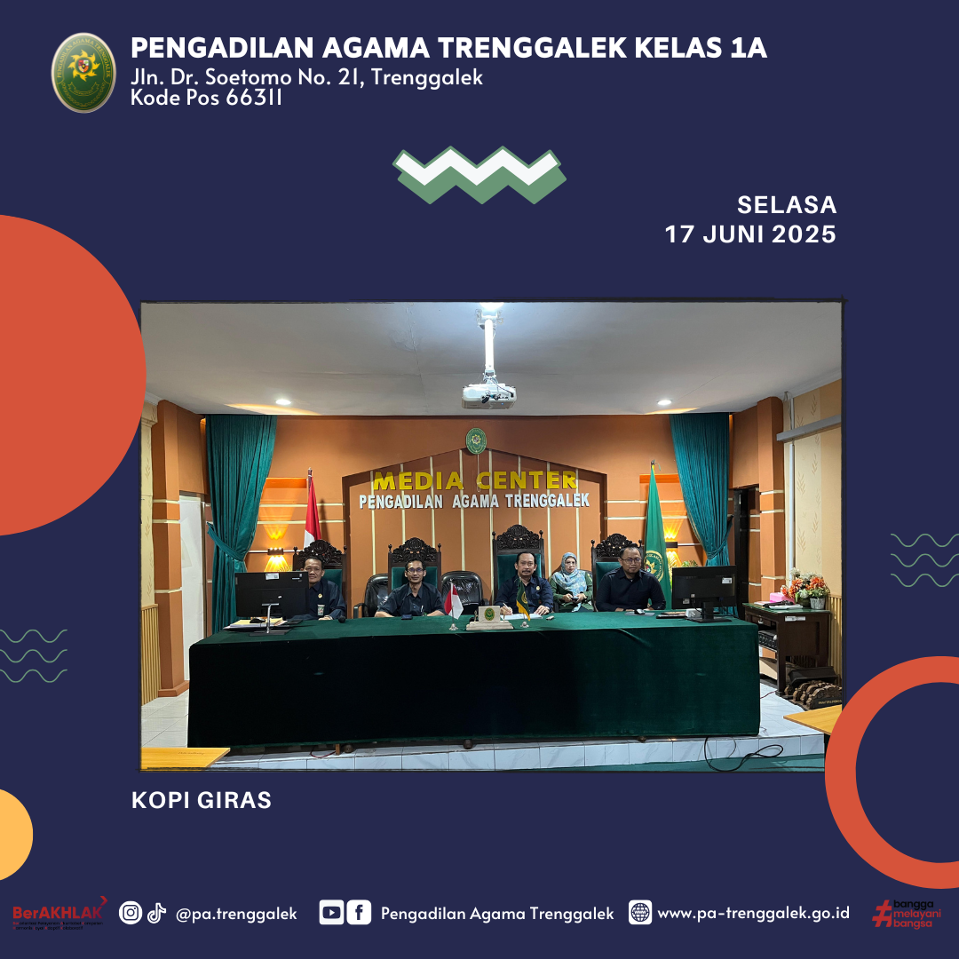 Trenggalek, 17 Juni 2025 — Pola promosi dan mutasi pegawai kesekretariatan di lingkungan Mahkamah Agung (MA) dan badan peradilan di bawahnya menjadi fokus pembahasan dalam kegiatan Kopi Giras yang diselenggarakan oleh Pengadilan Tinggi Agama (PTA) Surabaya secara virtual. Kegiatan ini menghadirkan narasumber Dr. Naffi, S.Ag., M.H. dan diikuti oleh jajaran kesekretariatan Pengadilan Agama se-Jawa Timur.