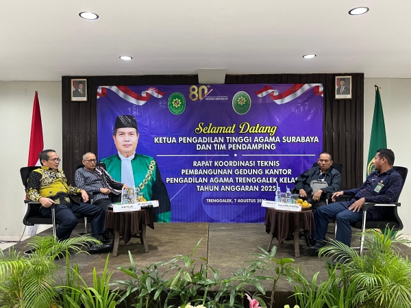 Trenggalek, 7 Agustus 2025 — Ketua Pengadilan Tinggi Agama Surabaya, Dr. H. Zulkarnain, S.H., M.H., bersama tim pendamping, melaksanakan kunjungan kerja ke Pengadilan Agama Trenggalek Kelas 1A dalam rangka meninjau secara langsung progres pembangunan gedung kantor baru serta melaksanakan Rapat Koordinasi Teknis dengan para pihak terkait pelaksanaan proyek tersebut.